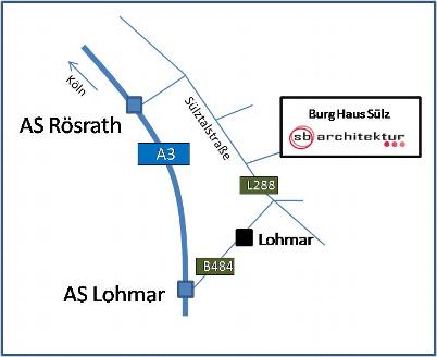 Sie finden uns im Innenhof des historischen Rittersitzes Haus Sülz, zu erreichen über die beiden nahegelegenen Anschlüsse "Rösrath" und "Lohmar Nord" der Autobahn A3.